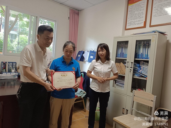 公司王小梅監事長(cháng)、公司運營(yíng)中心執行經(jīng)理汪茜,代表公司向“銅牌護理員”韓玉方同志頒發(fā)榮譽(yù)證書(shū)、授 “銅牌護理員”徽章 。