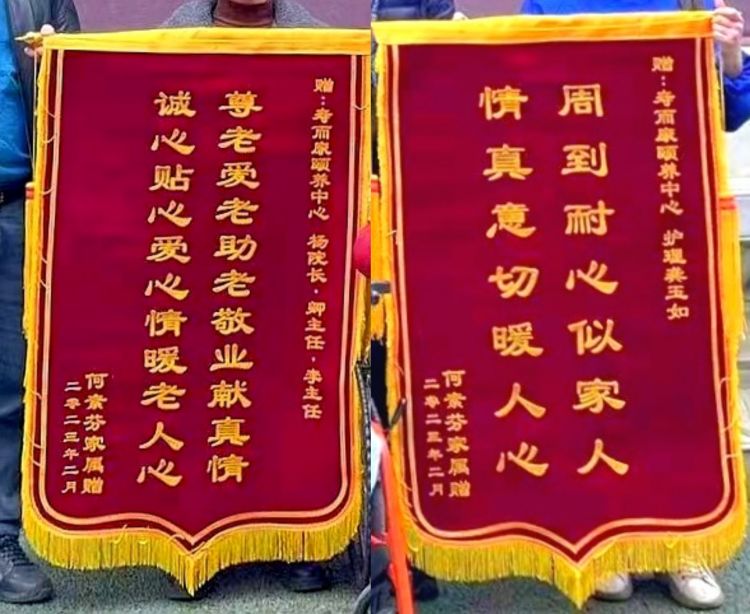 2023年2月26日,武侯區壽而康老年頤養中心收到來(lái)自住養人何素芬婆婆家屬送來(lái)的兩面錦旗: