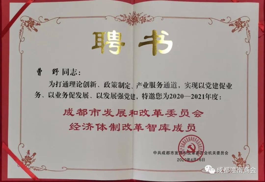 成都潼南商會(huì )秘書(shū)長(cháng)曹野獲聘成都市發(fā)展和改革委員會(huì )經(jīng)濟體制改革智庫成員