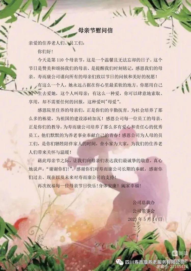 歲月匆匆,母愛(ài)濃濃。在2023年5月14日下午,成都市壽而康武侯院老年頤養將舉辦“母親節——傳承孝道 感恩母親”節日慶?;顒?dòng)。